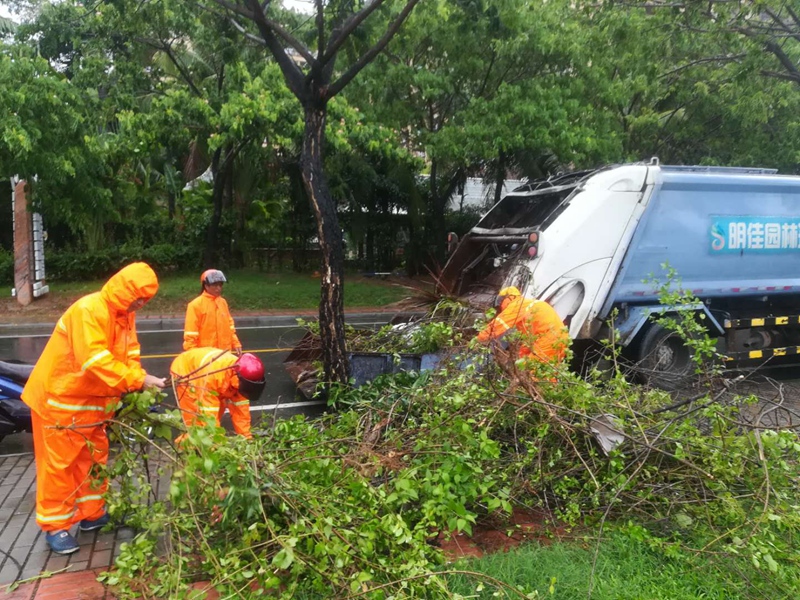 今年第9號(hào)臺(tái)風(fēng)“山神”的中心于今天凌晨4點(diǎn)50分前后,在海南萬寧市萬城鎮(zhèn)沿海登陸。受其影響,今天三亞、陵水有大到暴雨,將三亞、陵水街頭不少樹木刮倒,到處是殘枝敗葉,一片狼藉。臺(tái)風(fēng)中,為了確保市容環(huán)境的整潔、干凈,集團(tuán)公司安排環(huán)衛(wèi)工人全員上崗,加緊清理街道路面,使城市迅速恢復(fù)潔凈。