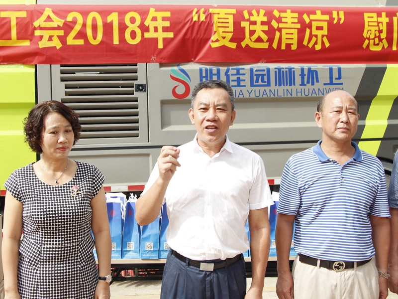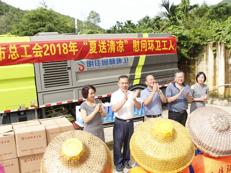 “你們辛苦了!感謝你們?yōu)槿齺喪忻、游客?chuàng)造了一個(gè)干凈整潔的人居環(huán)境,為三亞市“創(chuàng)文鞏衛(wèi)”工作作出的突出貢獻(xiàn)。”。張羽飛代表三亞市總工會(huì)向集團(tuán)公司全體職工致以親切的慰問。他指出,環(huán)衛(wèi)工人頭頂列日,揮灑汗水,以“寧愿一人臟,換來(lái)萬(wàn)家凈”的精神,為靚扮鹿城、建設(shè)國(guó)際化熱帶濱海旅游精品城市提供衛(wèi)生保障。他勉勵(lì)大家繼續(xù)發(fā)揚(yáng)三亞環(huán)衛(wèi)人的精神,勇當(dāng)尖兵的決心,提高環(huán)衛(wèi)作業(yè)質(zhì)量,在三亞市社會(huì)文明大行動(dòng)和新一輪“創(chuàng)文鞏衛(wèi)”工作中作出新的更大貢獻(xiàn)。