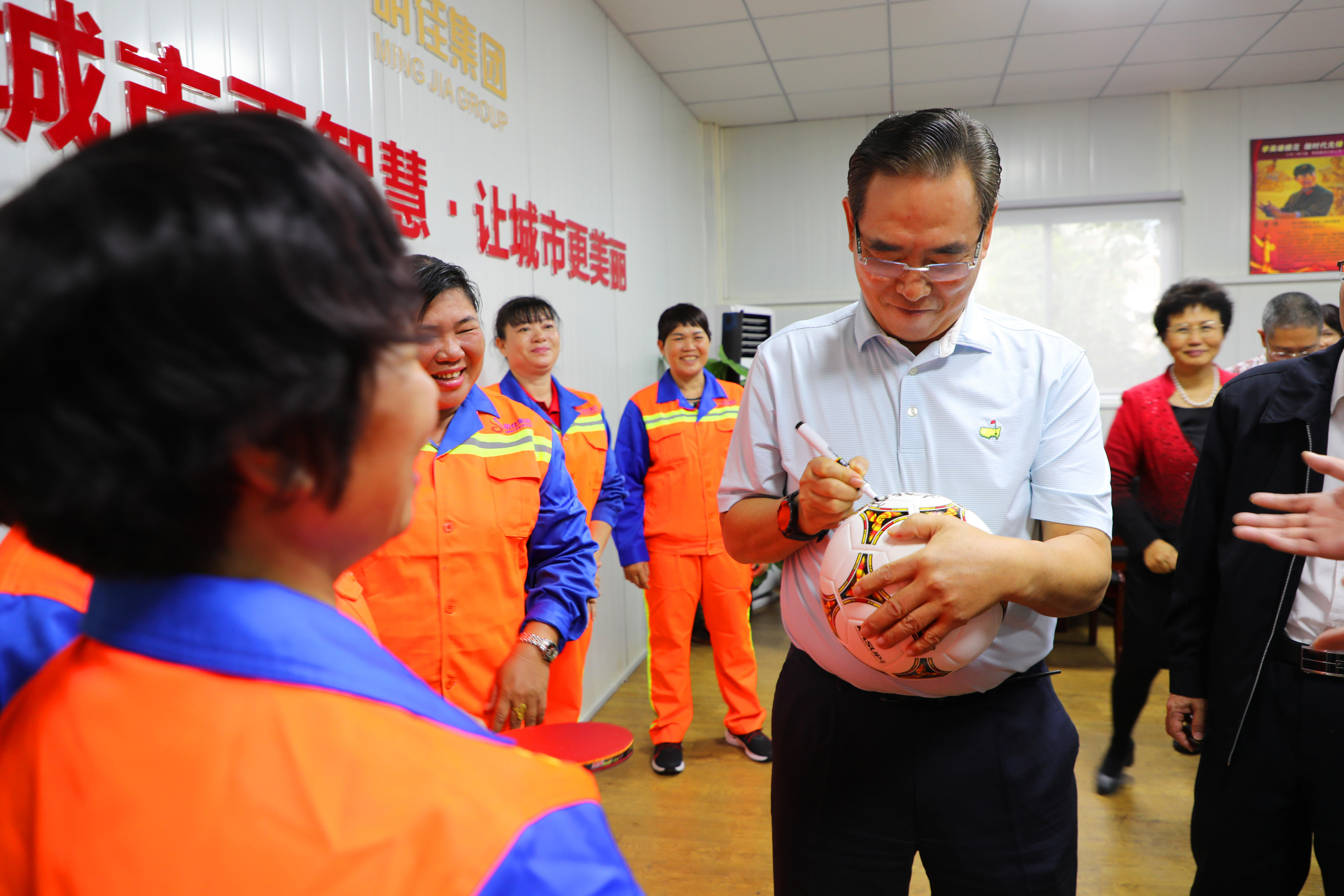 他肯定了明佳集團工會取得的成績,并親切慰問了現(xiàn)場的環(huán)衛(wèi)工人,與他們一一握手,并合影留念。